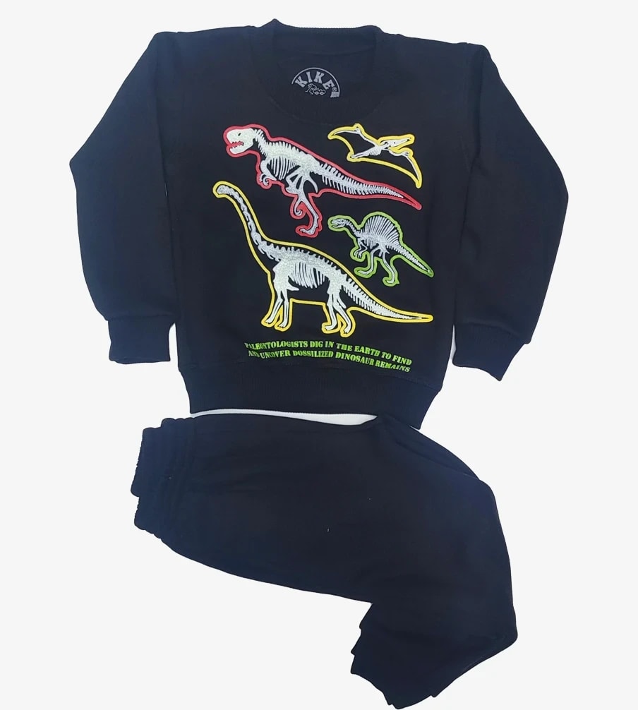 Conjunto deportivo de niño en suave franela de algodón. Su diseño de dinosaurios que brillan en la oscuridad lo hace perfecto para pequeños aventureros. ¡Comodidad y estilo prehistórico en un solo paquete!