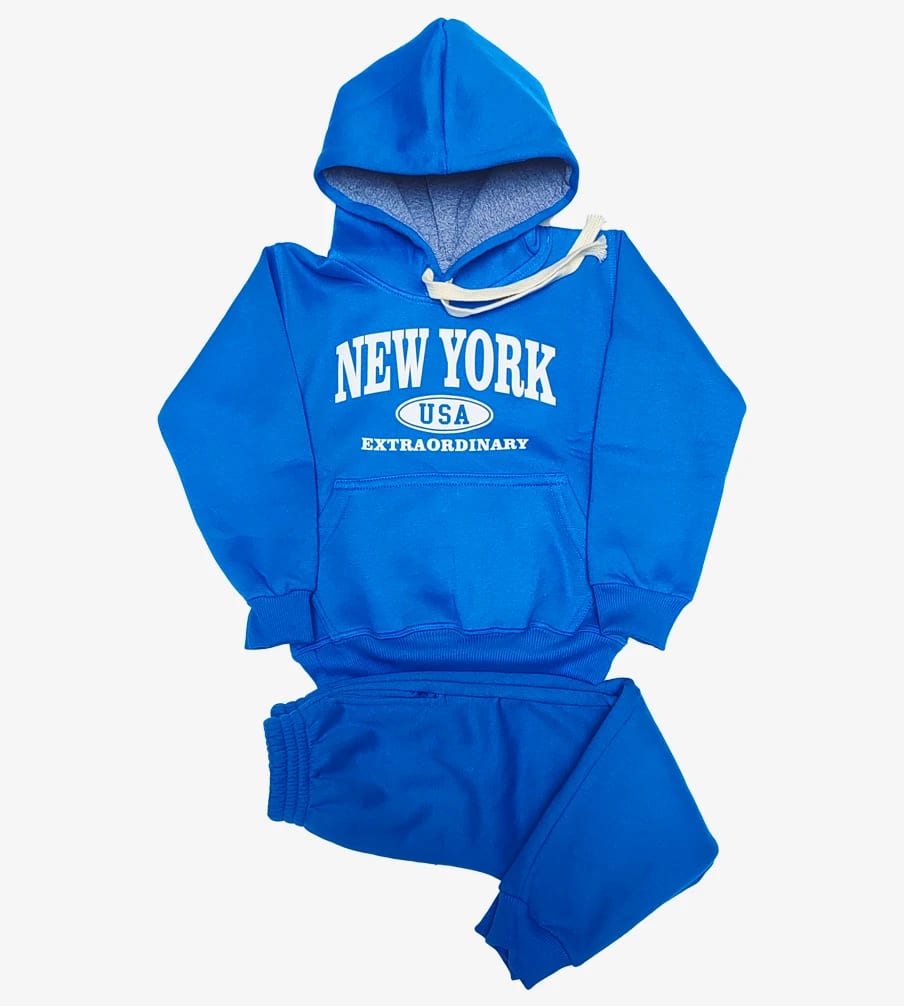 Conjunto para niños en suave franela, con capucha y estampado "New York USA Extraordinary". Ideal para un look cómodo y con estilo.