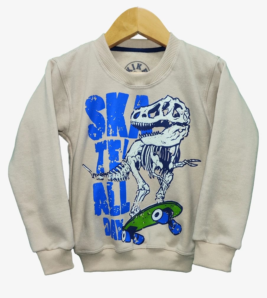 Tu pequeño skater amará esta sudadera de algodón suave con un dinosaurio skater que brilla en la oscuridad. ¡Perfecta para jugar todo el día! ! Brilla en la oscuridad !