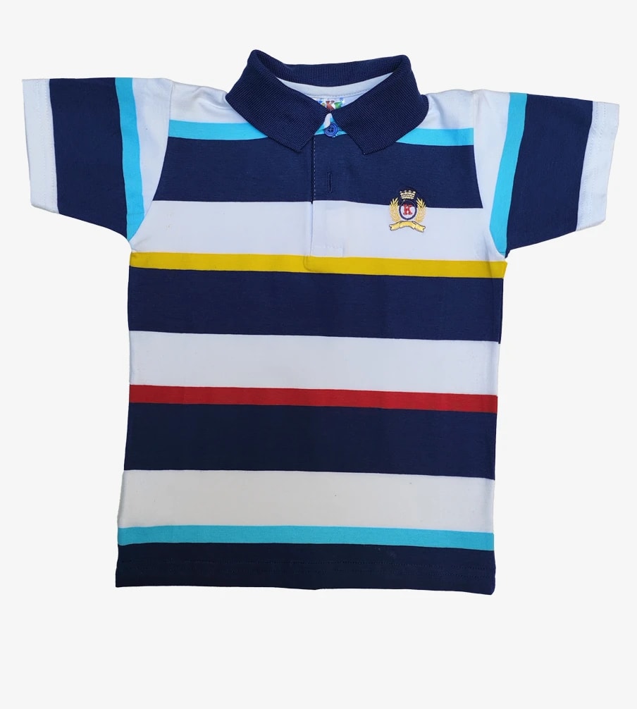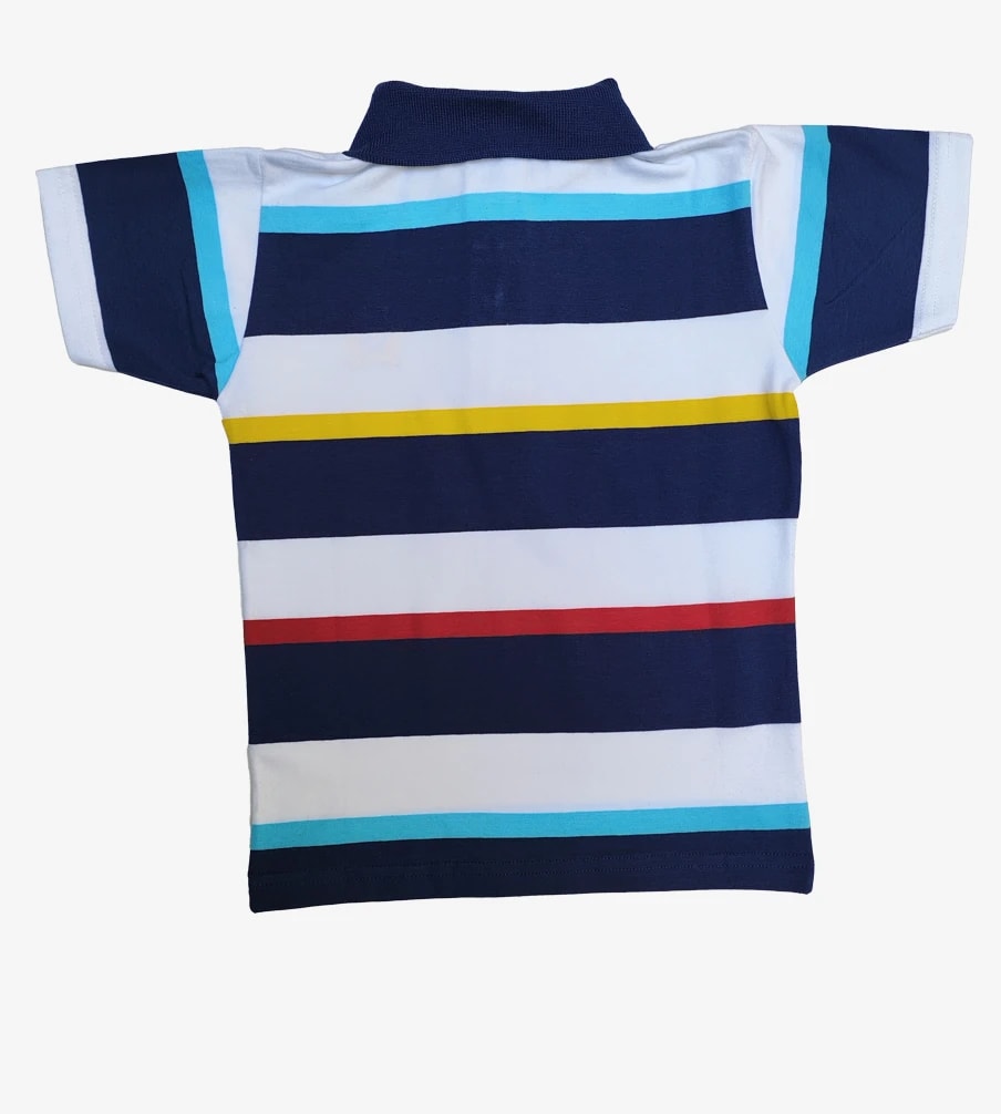 Polo a rayas multicolor para niño, con franjas azul marino, blancas, rojas, amarillas y turquesas. Cuello de polo clásico y cierre de botones. Confeccionado en algodón Pima, suave y cómodo. ¡Un look vibrante y alegre para los más pequeños!