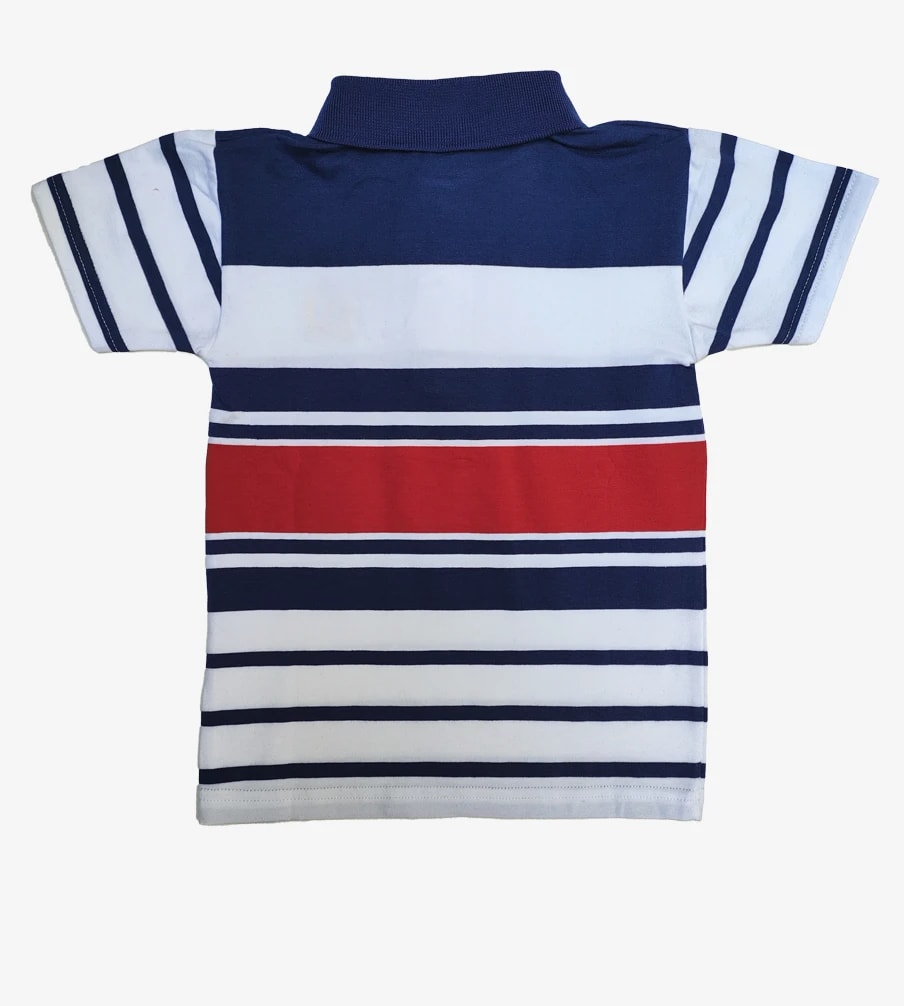 Polo a rayas marineras azul marino, blanco y rojo para niño, confeccionado en algodón Pima de primera calidad, suave y cómodo. Un estilo clásico y elegante para cualquier ocasión.