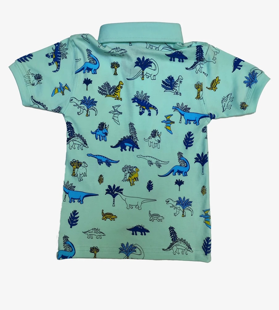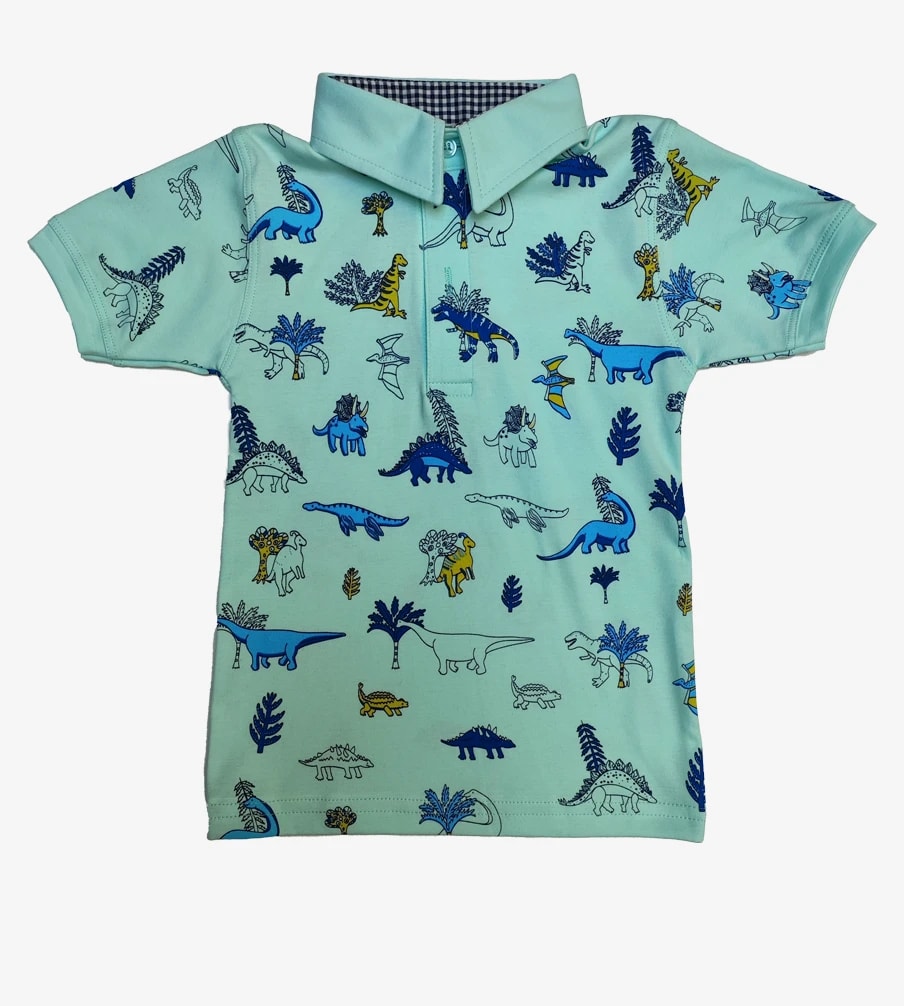 ¡Prepara la expedición jurásica! Esta divertida camiseta polo con estampado de dinosaurios en algodón pima suave es perfecta para pequeños exploradores.