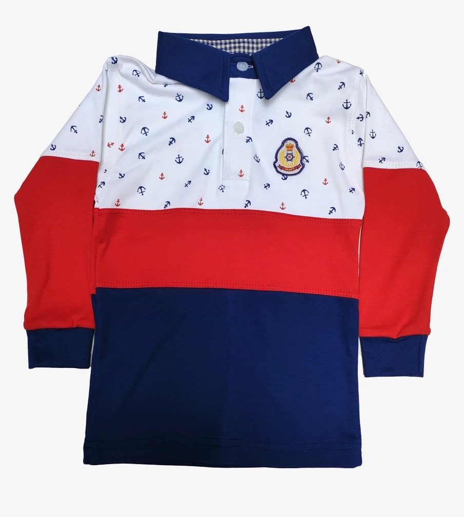 Polo náutico para niños, confeccionado en suave algodón pima. Su diseño tricolor y estampado de anclas le dan un look marinero clásico. Ideal para cualquier ocasión.