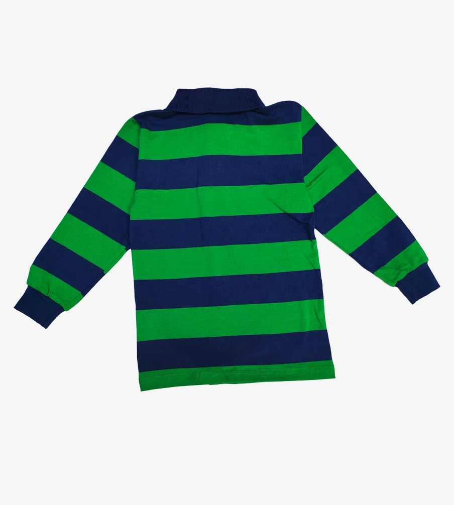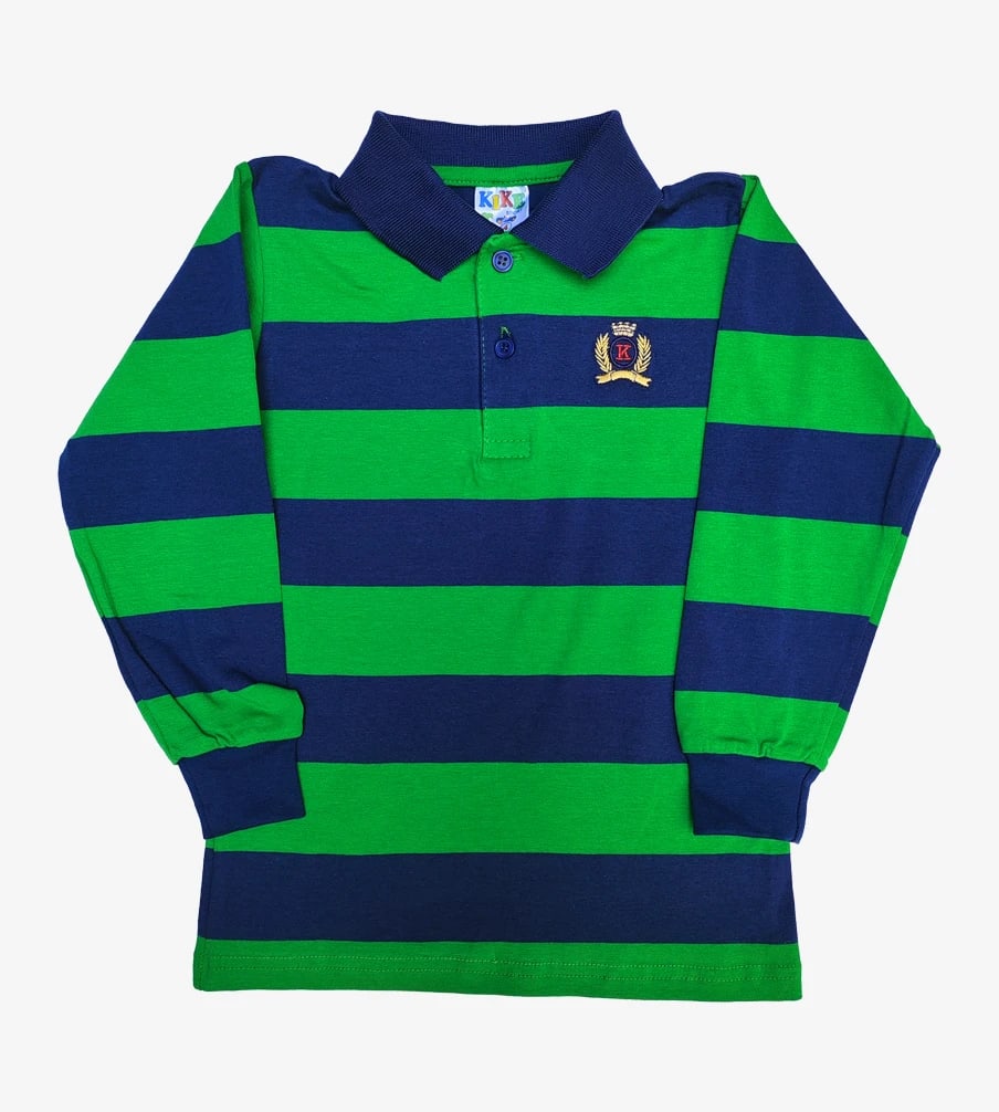 Polo a rayas verde y azul para niños, confeccionado en suave algodón pima. Diseño clásico con botones y detalle de escudo bordado. ¡Comodidad y estilo para los pequeños!