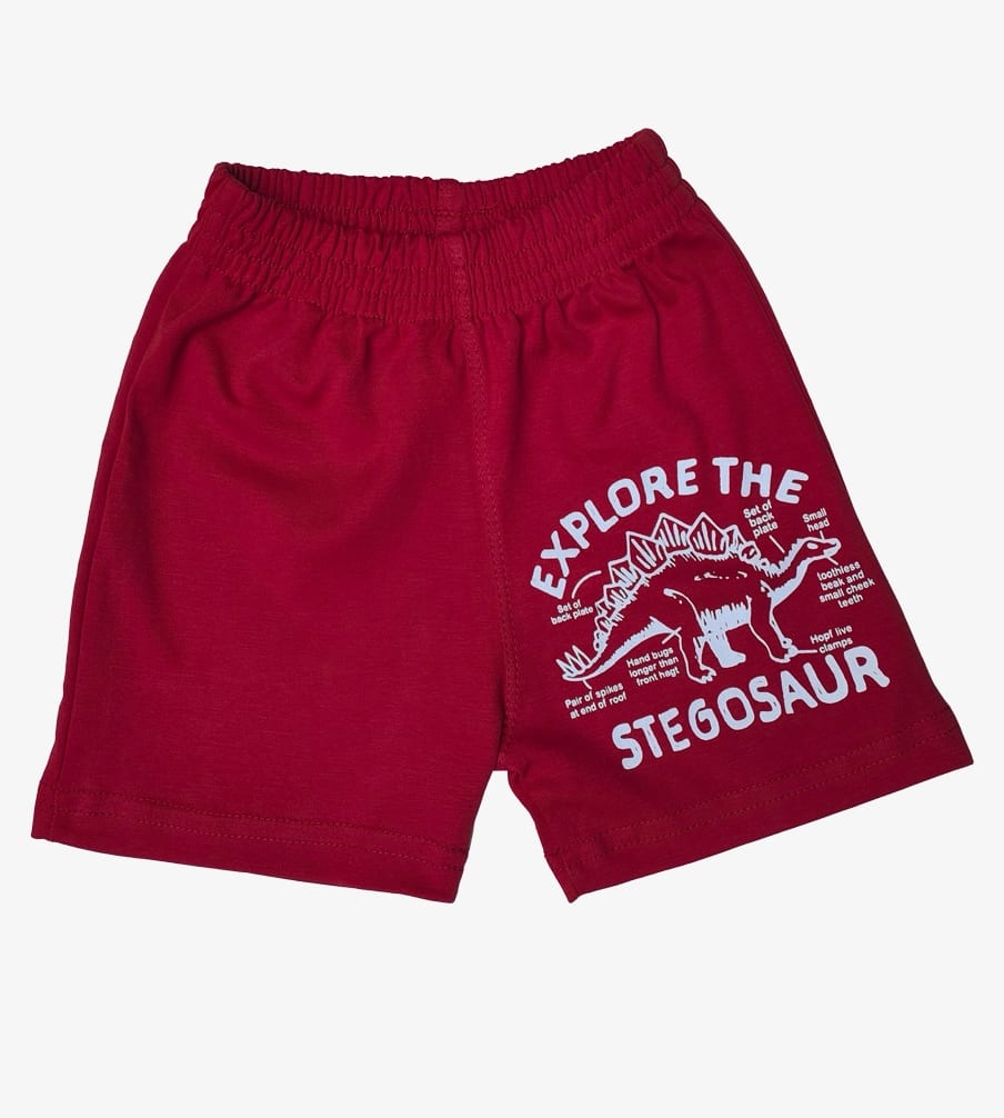 Short rojo de niño con diseño de dinosaurio Stegosaurus. Confeccionado para la comodidad y las aventuras de los pequeños exploradores.